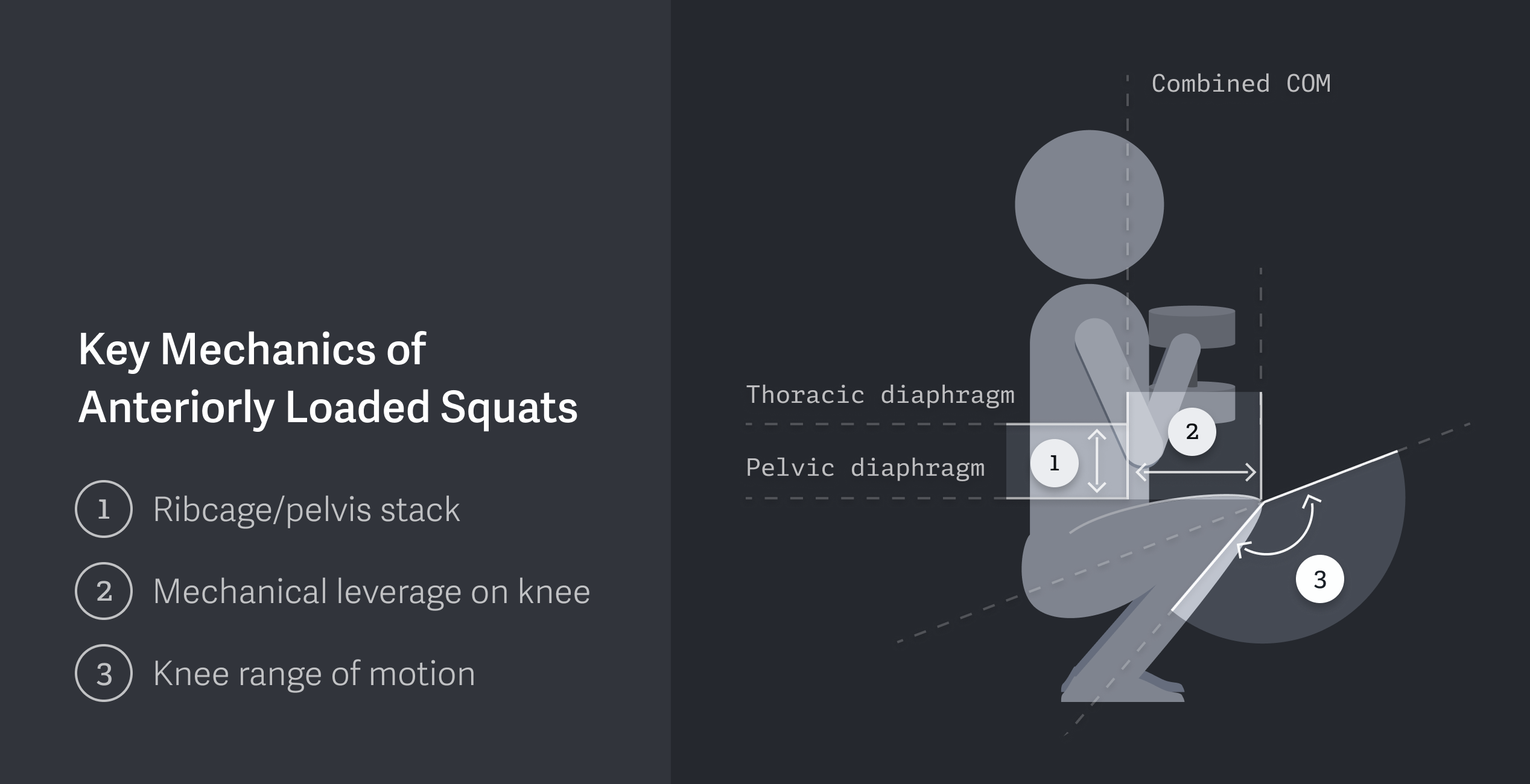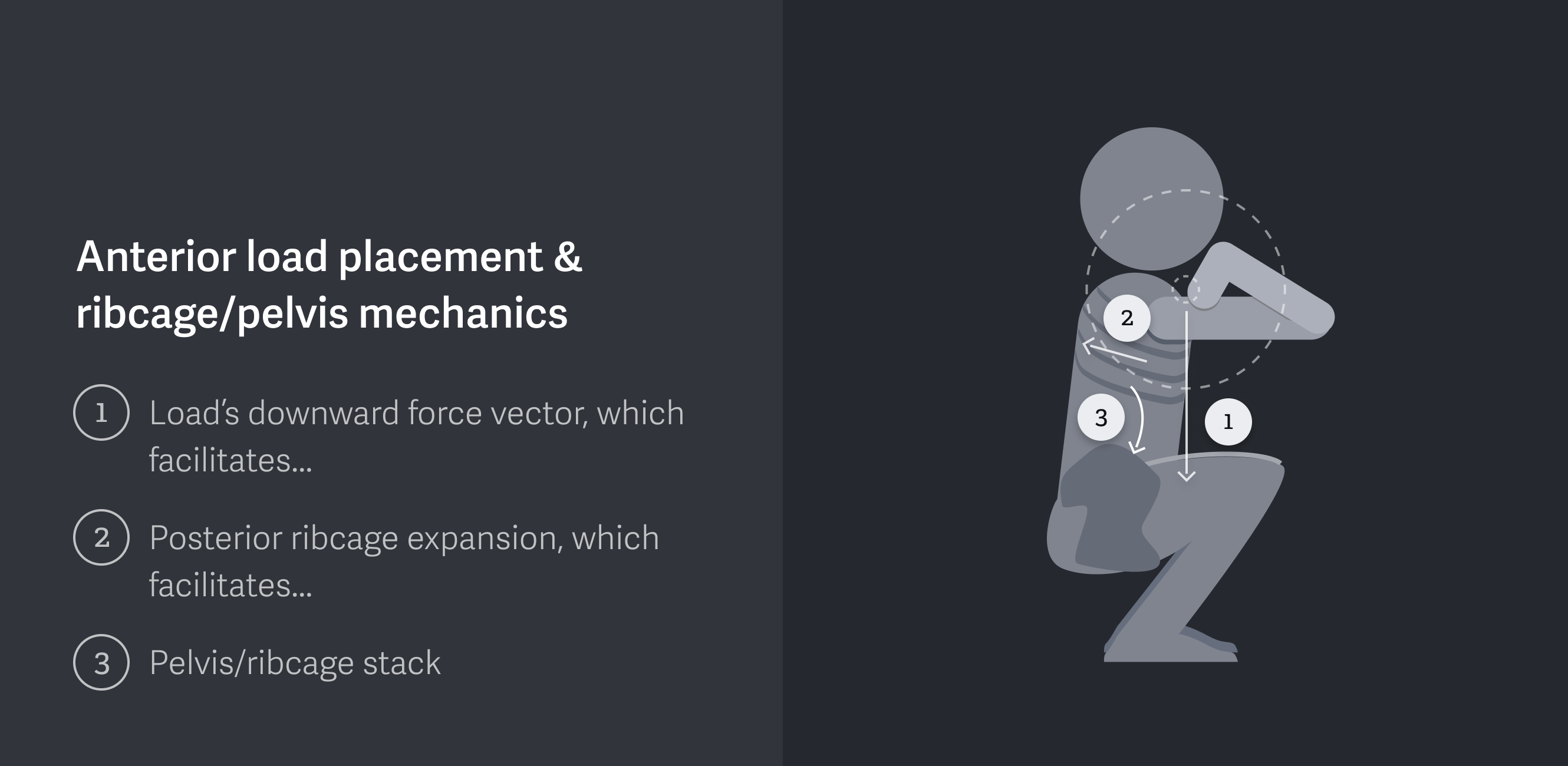 In the case of the Goblet Squat and the Front Squat, anterior loading both influences and constrains lifters to a "stacked" pelvis-ribcage position.