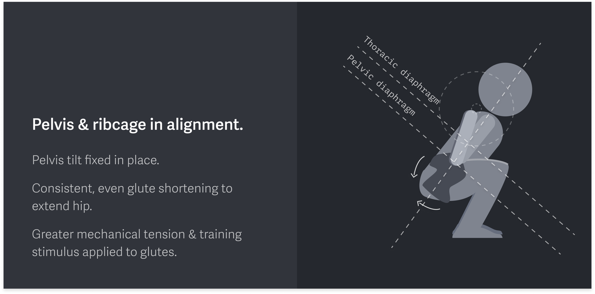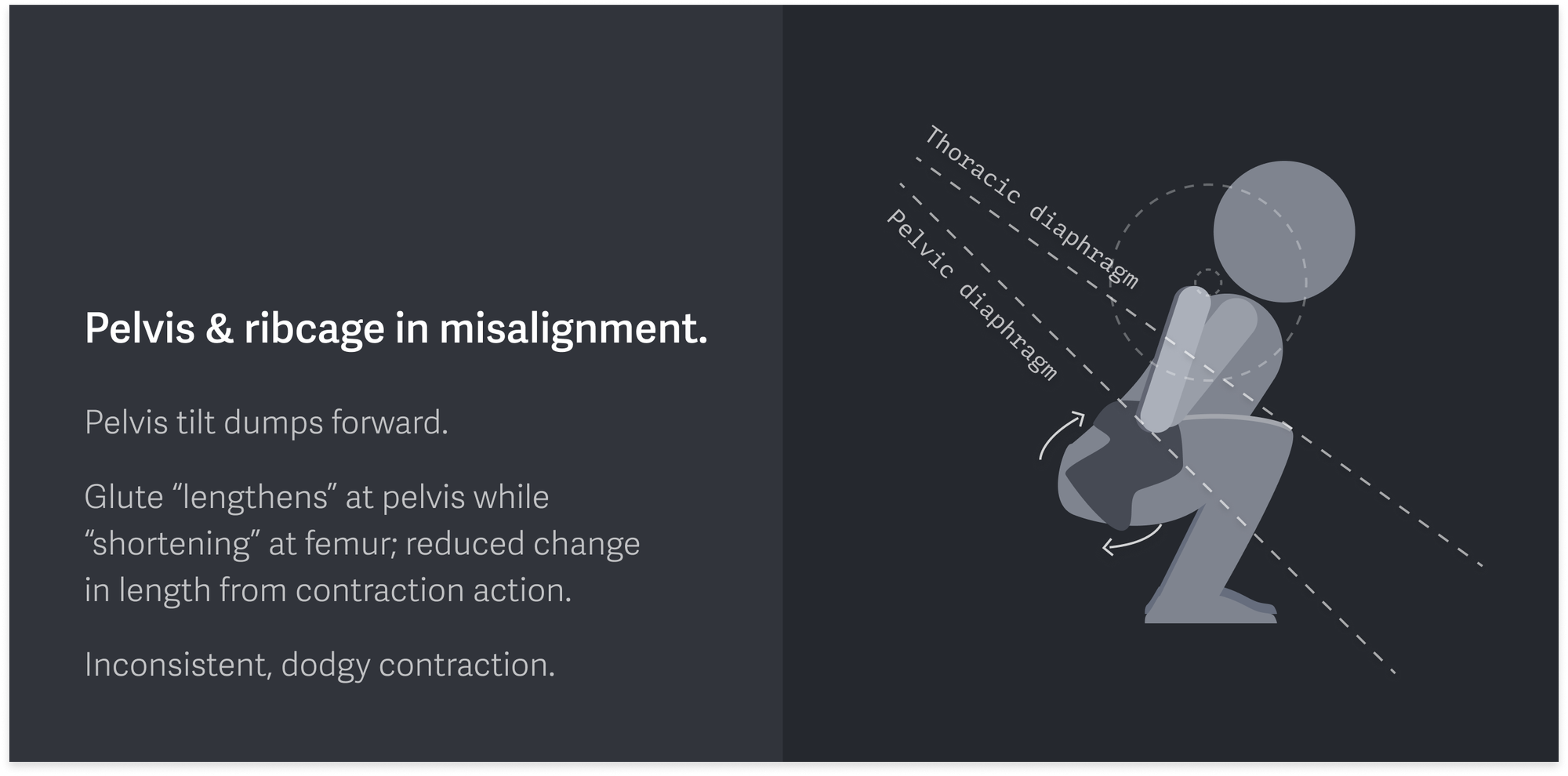 Good centre of mass management means keeping the ribcage and pelvis in their respective "stacked" orientations, which allows the glutes to express output force by way of a more even contraction.
